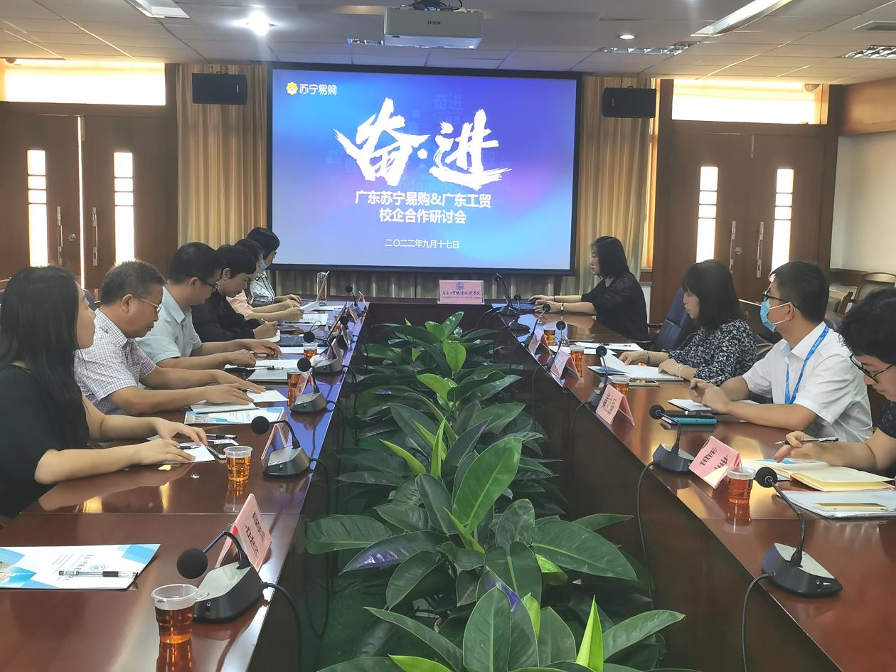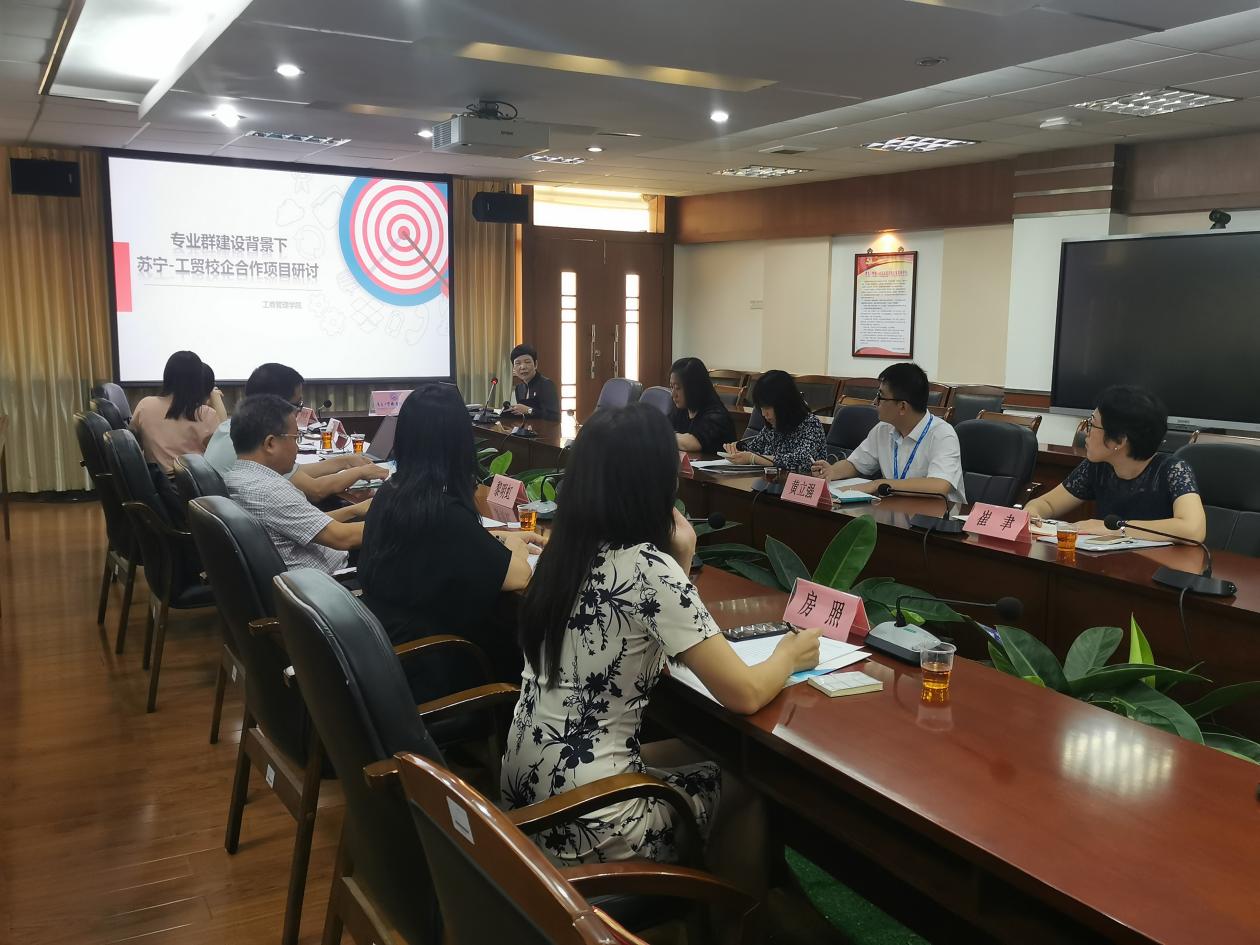 立足校企合作专业发展,谋划高水平专业群建设方案,9月16日上午,工商管理学院在天河校区中心会议室举行专业群建设背景下苏宁-工贸校企合作项目研讨会。广东苏宁易购销售有限公司总经理助理马岩、人力资源经理宋晖珲、冼丽均、黄立强;学校党委副书记、纪委书记夏韩辉、对外交流合作处处长黎明虹、工商管理学院党总支书记周清莲、院长邹德军、副院长倪春丽等参加了此次研讨会,会议由邹德军主持。