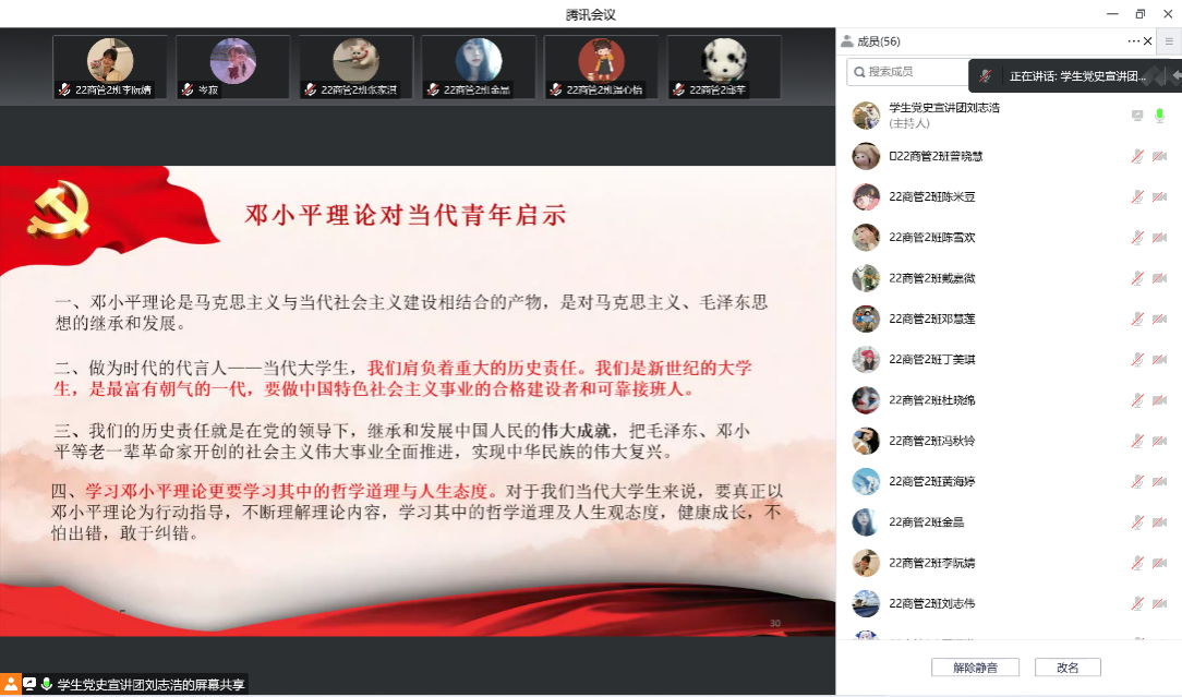 为让青年学生筑牢理想信念,厚植爱国情怀,深入了解中国共产党的奋斗历史,1025日,校学生党史宣讲团成员、工商管理学院学生第三党支部预备党员刘志浩向工商管理学院2022级商务管理专业2班以“记忆中的人民领袖——邓小平为题”开展了一次线上党史宣讲。