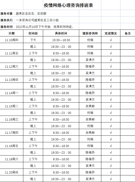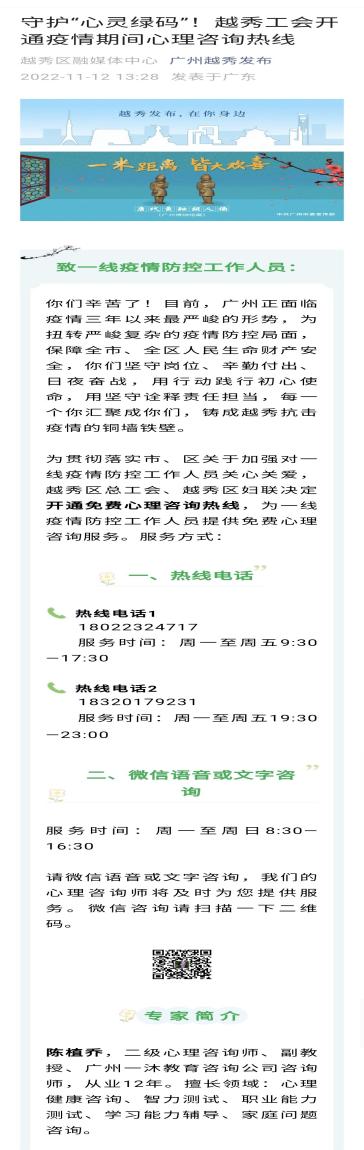 工商管理学院教师第一党支部书记、名班主任工作室负责人、二级心理询师陈植乔副教授,积极参与越秀区总工会、越秀区妇联开通的以“守护心灵绿码”为主题的免费心理咨询热线,加强对一线疫情防控工作人员关心关爱,为一线疫情防控工作人员提供心理健康、智力测试、职业能力测试、学习能力辅导、家庭问题等心理咨询服务。