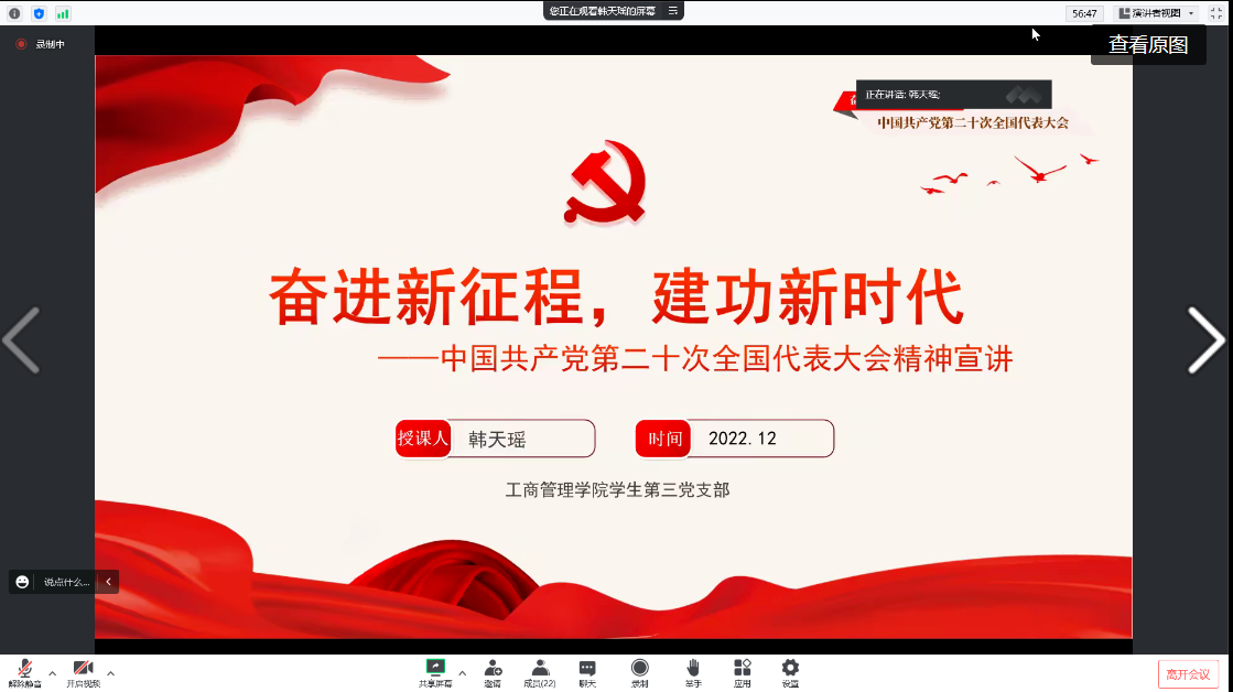 为深入学习宣传贯彻党的二十大精神,深刻认识党的二十大的重大意义,引领广大学生党员把思想和行动统一到党的二十大精神上来,根据学校党委统一部署,工商管理学院学生第三党支部书记韩天瑶于12月15日在腾讯会议平台面向支部全体党员开展了党的二十大精神专题党课宣讲。