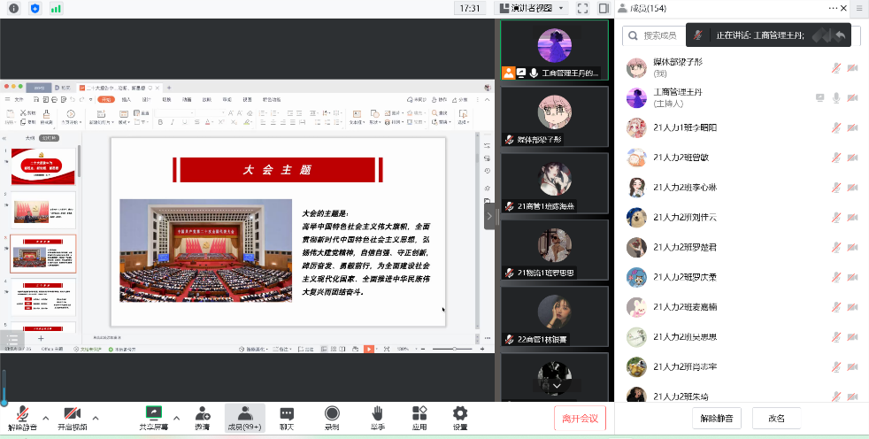 为深入学习宣传贯彻党的二十大精神,12月28日下午,工商管理学院通过腾讯会议开展以“党的二十大报告中的新观点、新论断、新思想”为主题的宣讲会,由党的二十大精神学校宣讲员、工商管理学院辅导员王丹老师进行主讲,商业服务系全体学生干部、入党积极分子和党员发展对象参加。