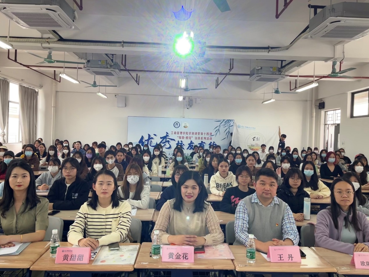 以习近平同志为核心的党中央高度重视就业问题,始终把促进就业摆在优先位置,并针对新形势新情况,对实施就业优先战略作出新的全面部署。工商管理学院深入学习贯彻了党的二十大精神,针对就业充分发挥优秀校友的榜样作用,加强学生对就业的了解,助力学生从容面对生涯选择、做好学业与职业生涯规划。2023年3月14日,工商管理学院学术创新中心在白云校区明德楼2区604举办了“知微·酌见”访谈系列活动之“优秀校友有约”。学术创新中心指导老师欧阳翠婷、辅导员黄甜甜、周敏、王丹以及学院150多名学生代表参加了本次活动。
