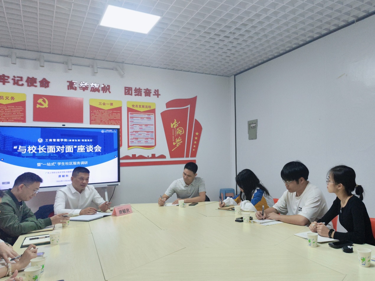 为深入推进“一站式”学生社区建设工作,不断完善全员、全过程、全方位育人格局,践行“以学生为中心”的理念,充分了解学生的学习、生活现状,全面地摸清当前我校学生的主要诉求。11月24日晚,学校党委委员、副校长唐毓秋深入学生社区,在白云校区子新1号楼102党员活动室与工商管理学院学生代表开展“与校长面对面”座谈会暨“一站式”学生社区服务调研,工商管理学院党总支副书记谢宏祥主持了会议。