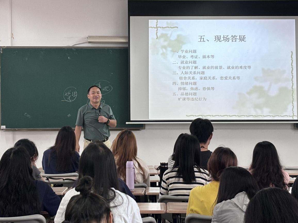 随后,会议进入现场答疑环节。龚伟志将各班级存在的心理问题总结为学业、就业、人际关系、情绪和品德五大类型,并提出三个问题化解小妙招:一是要坚持运动,在运动中放松自己的身心,让烦闷情绪归零;二是在快乐的心境中做自己喜欢做的事情,享受每一个瞬间;三是要设定明确的目标,找到前进的动力,成为更好的自己。