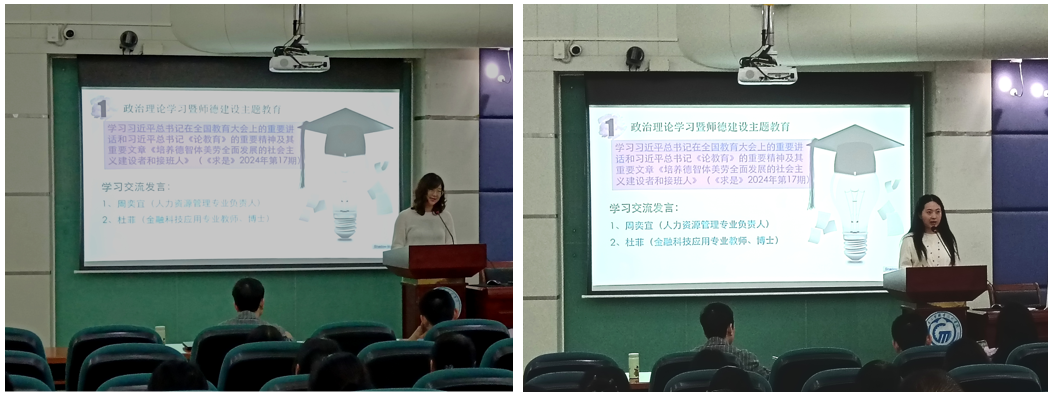 人力资源管理专业负责人周奕宜和金融科技应用专业教师杜菲博士分别作学习交流发言。周奕宜从教育的地位、目标、理念以及自身的教师职业素养提升等角度谈了如何贯彻落实习近平总书记在全国教育大会上的重要讲话精神。杜菲以科技发展为牵引、注重培养大国工匠的工匠精神开展高职教育这两个角度谈了自己的学习思考。