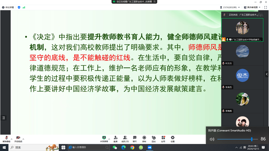 10月22日晚上,工商管理学院财税服务系召开学习贯彻党的二十届三中全会精神、习近平总书记重要讲话和全国教育大会精神研讨会。会议通过线上方式进行,财税系全体教师参加了会议,财税系主任胡建平主持会议。