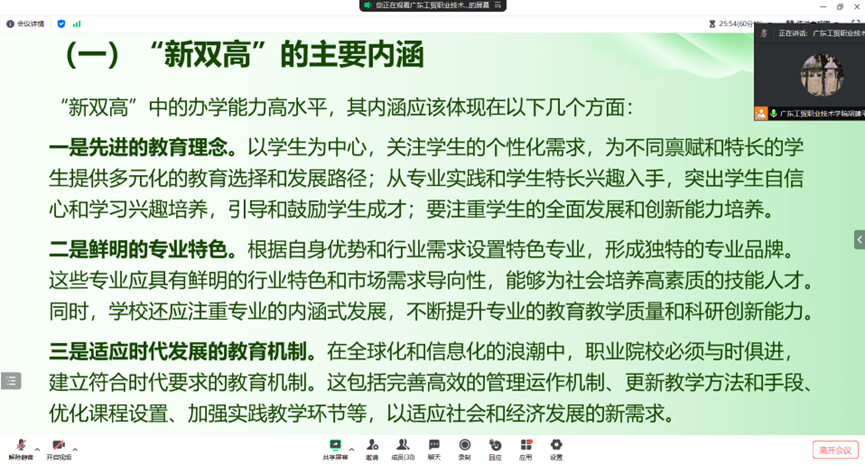 最后,胡建平对本次线上研讨会作总结,期望在场的各位老师能够深刻领会并认真贯彻落实党的二十届三中全会精神、习近平总书记重要讲话和全国教育大会精神,这是当前我们教育工作的重要指导方针,我们职业教育工作者要以此为契机,积极为新一轮的双高建设做好充分准备,以创新的思维和扎实的实践共同推动职业教育事业的发展。