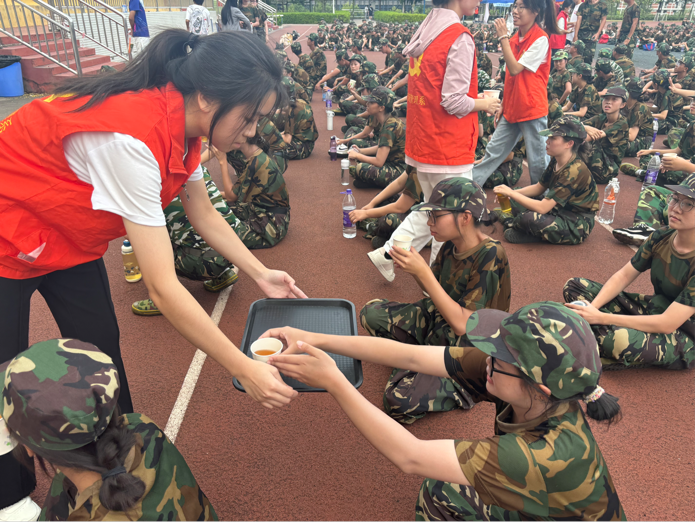 每到新生军训短暂休息期间,学生党员们争分夺秒贴心地向新生和教官们送上精心准备的花茶并叮嘱做好防暑降温工作,为在炎炎烈日下坚持训练的新生带来了一抹难得的清凉与舒爽,更蕴含着学院对新生深切的关爱与殷切的鼓励。借此机会,党员同志也向同学们表达了期望,希望他们能够继续保持并发扬坚韧不拔、勇于拼搏的精神风貌,以饱满的热情和坚定的意志圆满完成军训任务,在军训中收获自我成长和蜕变。