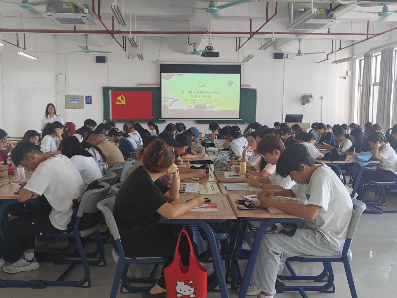 为扎实开展第四十三期入党积极分子党课培训工作,进一步提升入党积极分子的思想认识,增强党性修养,提高政治素养,2024年11月12日,工商管理学院党总支在明德楼2-601教室开展了党章学习交流会。