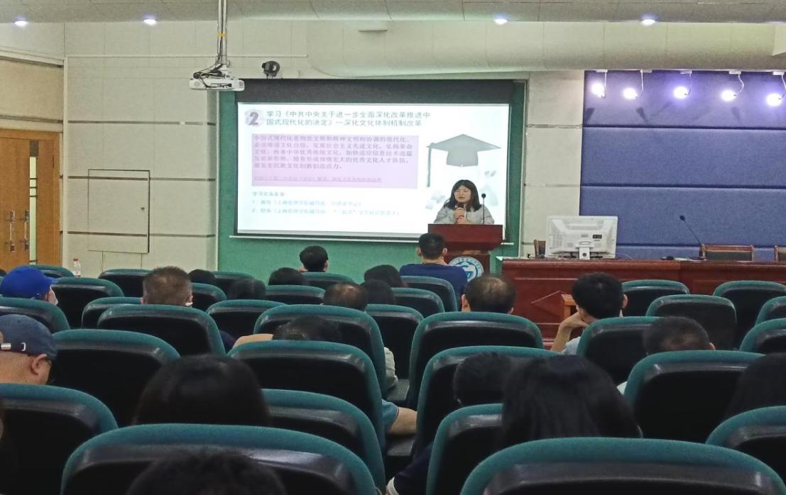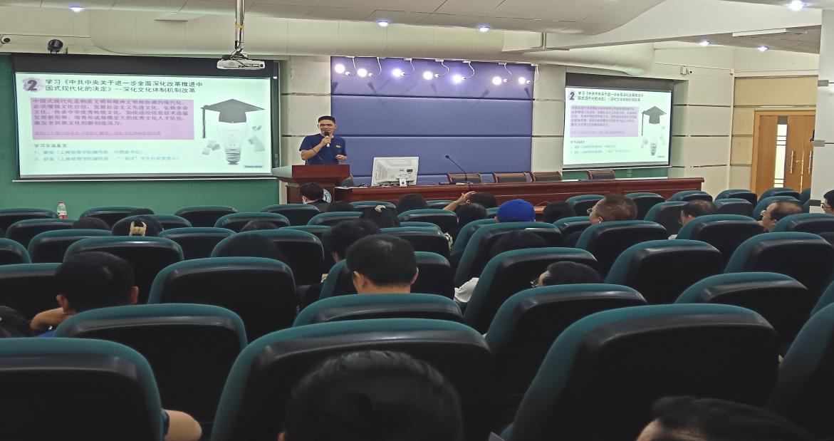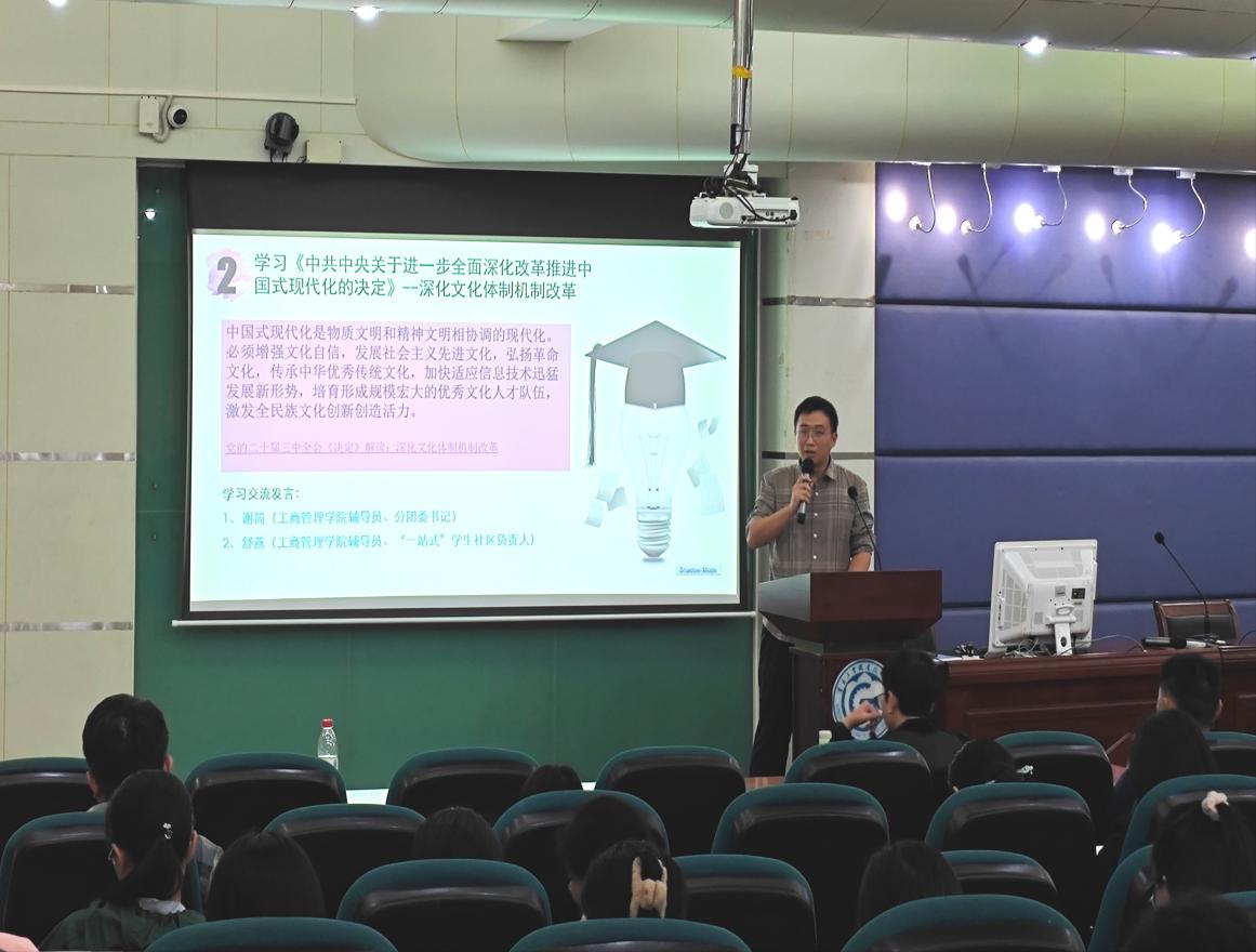 谢宏祥首先带领全体教职工学习习近平总书记关于文化建设和传统文化传承的重要论述以及党的二十届三中全会《决定》中“深化文化体制机制改革”部分内容,他强调,要把习近平文化思想融入学院“大思政课”,守正创新开展好“党建引领、文化传承、匠心筑梦”育人品牌,实现先进理论与育人实践相结合,努力培养担当民族复兴重任的时代新人。工商管理学院辅导员、分团委书记谢简和工商管理学院辅导员、“一站式”学生社区负责人舒燕分别作学习交流发言。
