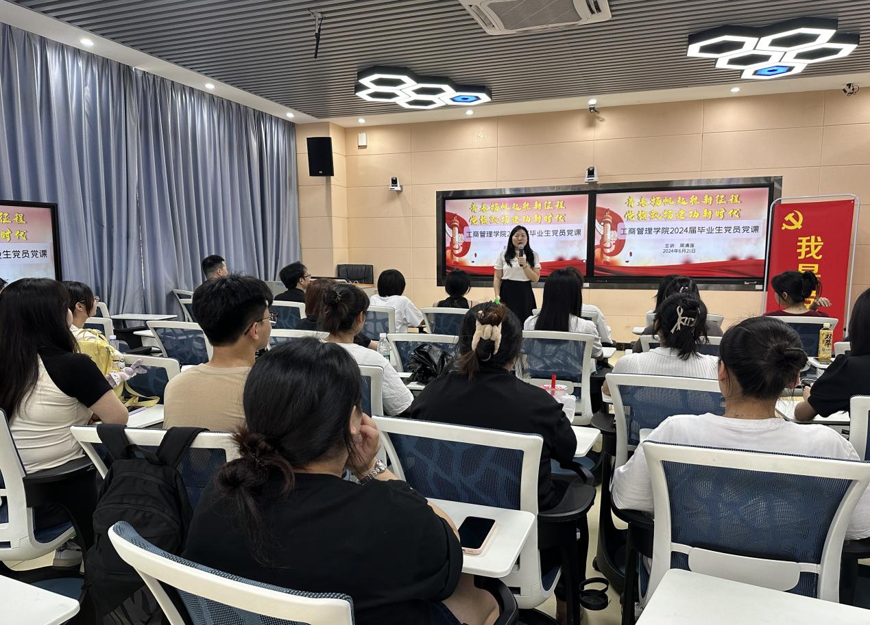 2024年6月21日,工商管理学院党总支书记周清莲在明德楼1-316为学院2024届全体毕业生党员讲授毕业前最后一次党课。这是毕业生党员在校接受的最后一次党性教育,旨在引导青年党员铭记初心使命,以青春之力投身强国建设。