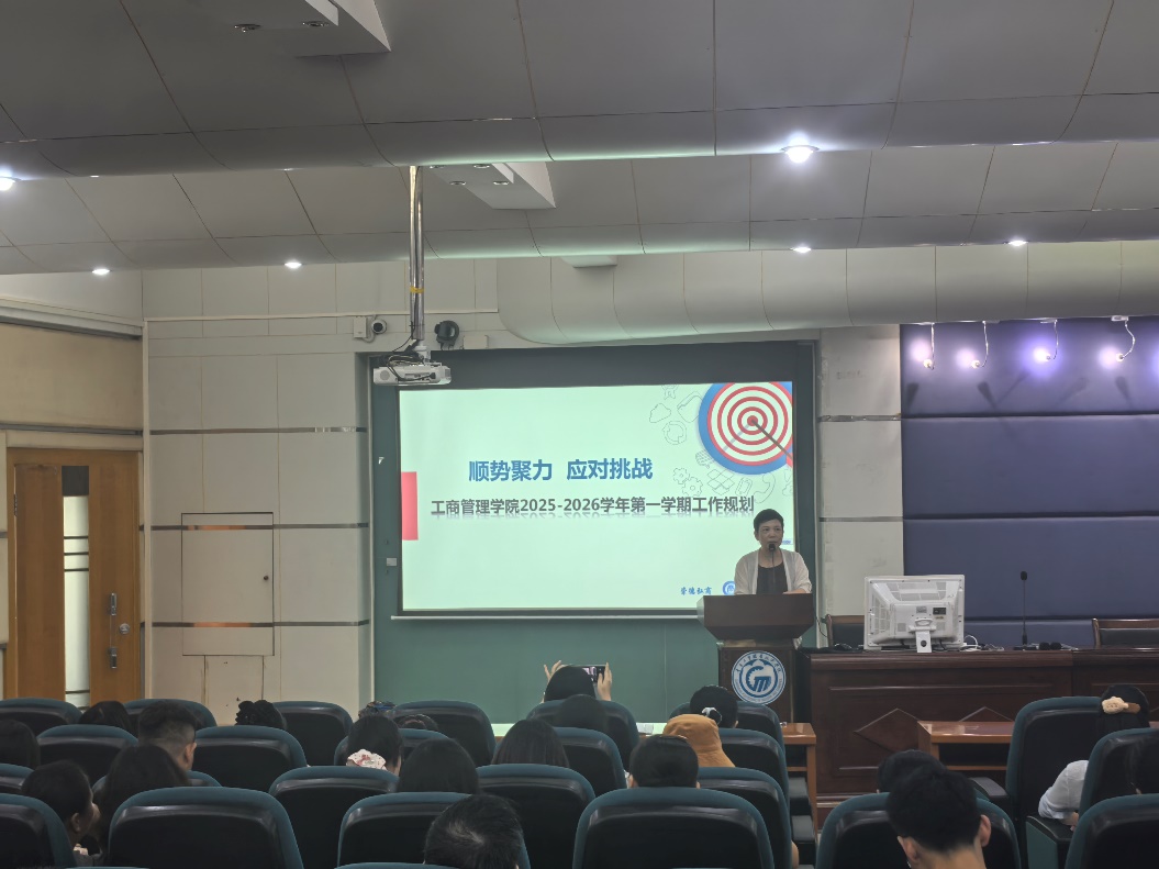 9月2日下午,工商管理学院2025-2026学年第一学期全体教职工大会在天河校区西区报告厅召开。学院党政领导班子成员及全体教职工齐聚一堂,共谋新发展,共绘新蓝图。大会由工商管理学院党总支书记周清莲主持。