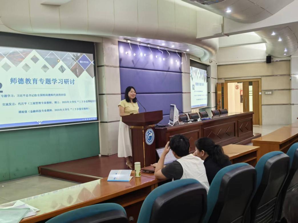 在师德教育专题学习研讨环节中,周清莲带领与会教师共同学习了习近平总书记给全国特岗教师代表重要回信精神。青年教师代表代月平和谭雨倩就学习内容进行了交流发言,她们结合自身在暑期指导学生参加“百千万工程”突击队开展暑期社会实践活动的经历,讲述了发生在乡村振兴一线的育人故事,回应了习近平总书记对于广大教师要坚守教育初心,不断提高教书育人本领的殷切期望。