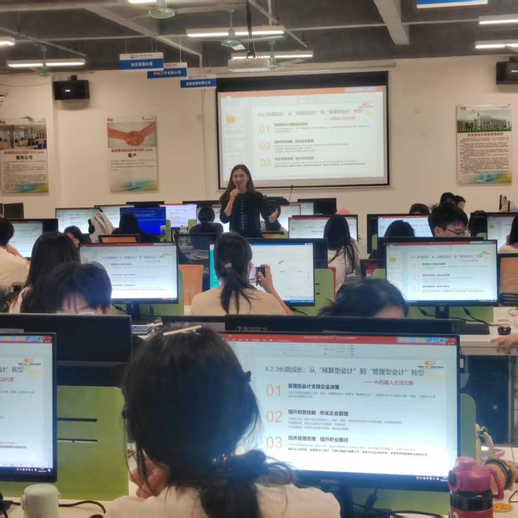 聘任仪式后,潘小平以企业导师身份走进实训课堂,为学子们带来精彩的实战分享与实训指导。潘小平强调会计工作“严谨细致、合规为先”的核心职业准则,并针对数字化时代业财税深度融合、财务共享、AI技术对会计行业的影响等热点议题,展开条理清晰、内容详实的专业解读;面对学生在模拟实训中普遍遇到的纳税申报、成本核算方法选择等实操难点,她通过企业真实业务案例拆解抽象理论,将晦涩的会计原理转化为具象可感的实操步骤,有效降低了理解难度。