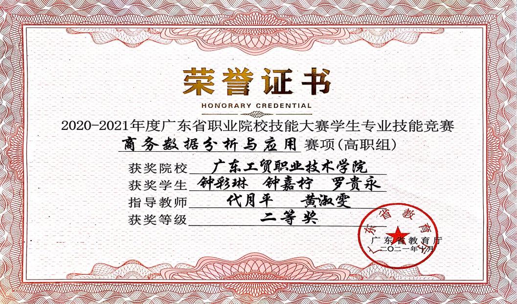 学生获得2020-2021年度广东省职业院校技能大赛学生专业技能竞赛商务数据分析与应用赛项二等奖