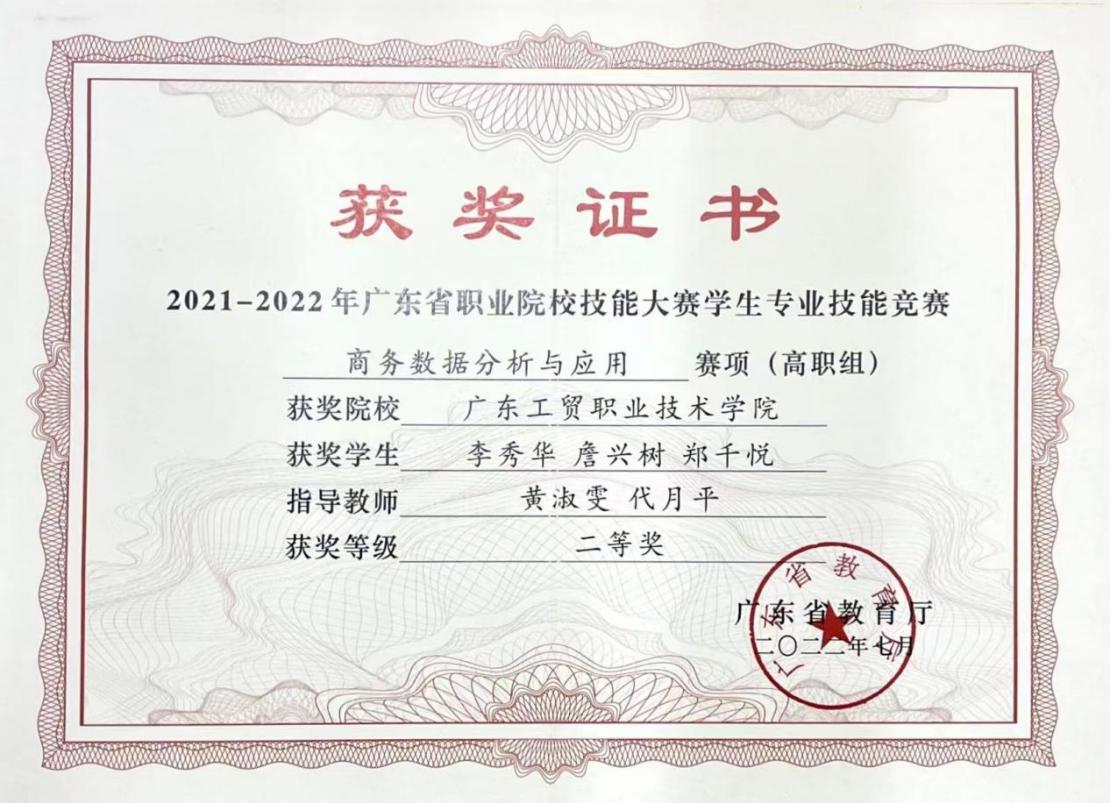 学生获得2021-2022年度广东省职业院校技能大赛学生专业技能竞赛商务数据分析与应用赛项二等奖