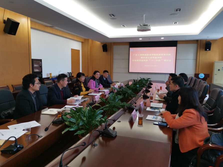 1月14日上午,肇庆市工业贸易学校副校长罗红金、教务科科长冯华、招生就业办主任张辉、基础部部长李素琼一行一行4人莅临我校开展中高职贯通培养“三二分段”研讨会。我校学生处处长刘建军,经济贸易学院党总支副书记书记王坤明(主持工作),院长邱秀芳,党总支副书记龚云,副院长方洁热情接待。