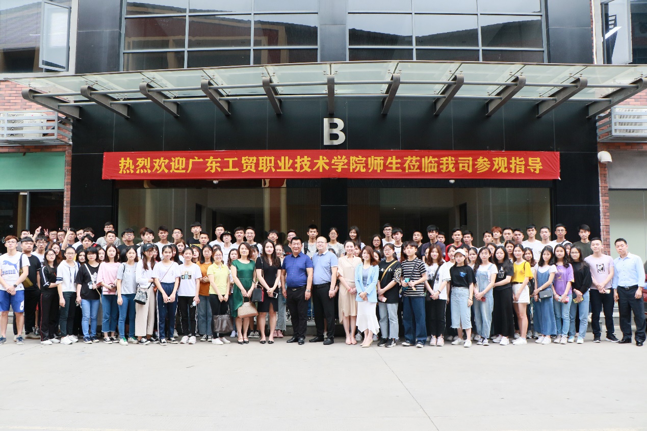 同学们一下车就受到了公司全体中高管层的热烈欢迎,并在公司门口合照留念。