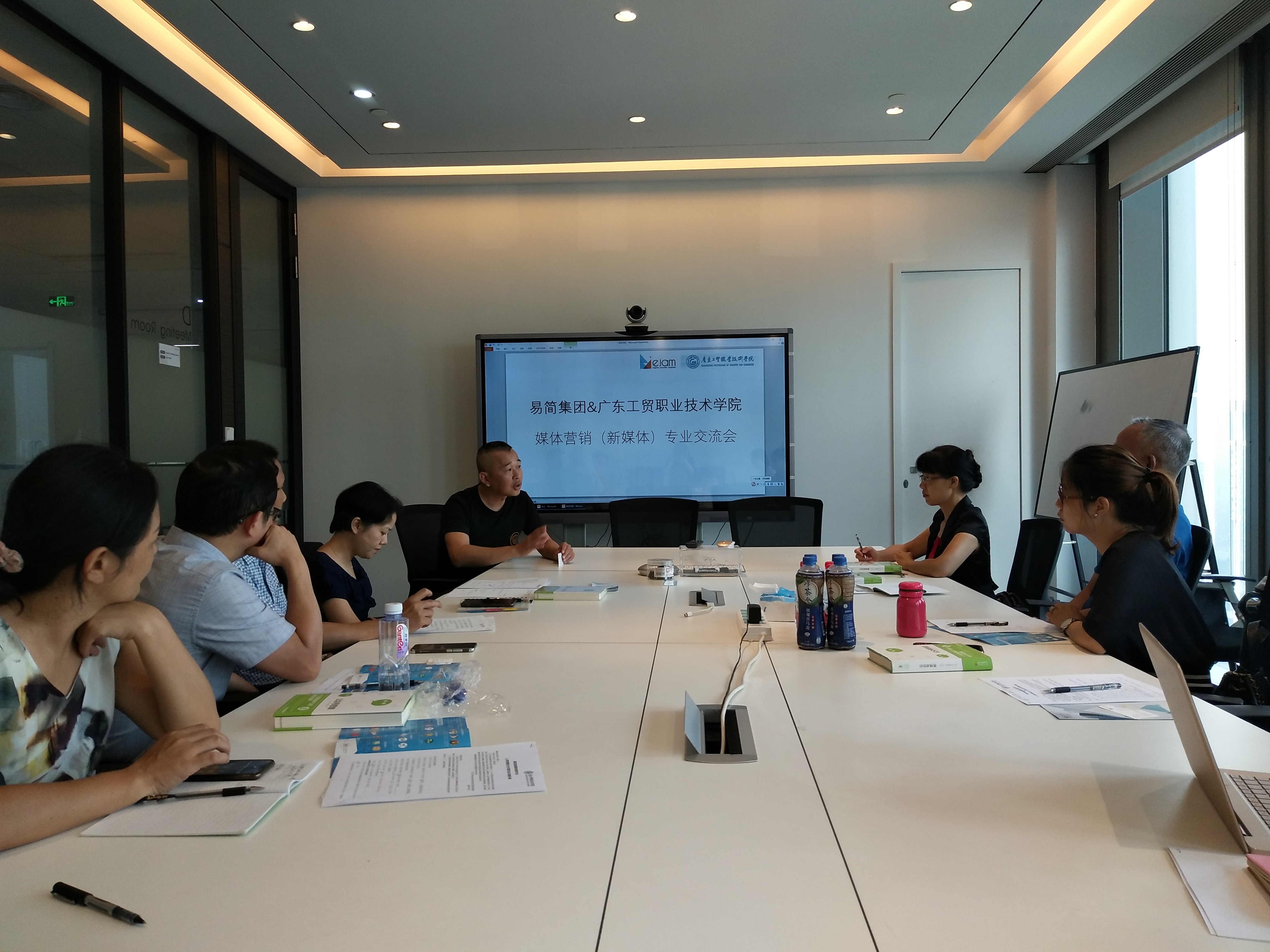 8月13日,教师团队来到此次调研行的第一站广州易简集团。易简集团位于广州CBD第一高楼东塔,是一家专注于新媒体、新营销建设的传媒集团,成立于2010年,前身为谷果软件,2016年5月更名为易简集团。公司秉承精于业,简于行的价值观,致力于新媒体资源和线下媒体渠道建设,在新媒体及渠道资源服务的基础上,通过敏锐的行业洞察、为企业提供打通线上线下的新媒体营销解决方案。研讨会上,易简集团总裁黄永轩先生详细向各位老师介绍了新媒体营销业务情况以及未来行业发展趋势,邱院长和彭娟教授就新媒体专业市场前景,媒体营销内容模式、人才技术需求等和黄总进行了详细的探讨。