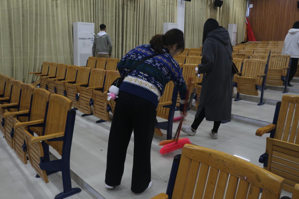 作为新时代的入党积极分子,不仅要加强党章党规的理论知识学习,提升自己的思想觉悟,还要将理论与实际相结合,提高自己的社会实践能力,从而提高自身的综合素质。开展社会实践活动,把所学到的理论知识运用到实践中,加深自身对党的指导思想的认识。同学们在组织的分工下,有秩序地到自己负责打扫的区域,对地面以及演艺厅的椅子进行了清扫。清扫过程中,同学们分工合作,相互配合,相互帮助。每一位同学都积极参与到此次的社会实践活动中。在同学们的合作下,正门圆盘地面以及同学们上课的演艺厅的面貌焕然一新,为广大师生提供了一个干净、舒适的校园环境。
