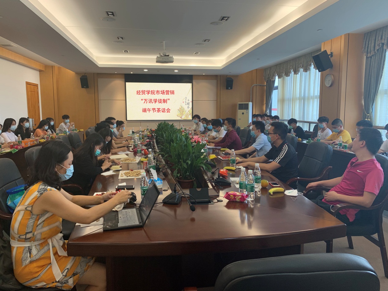 在我国传统节日——端午节即将来临之际,经贸学院专门为即将赴企业开展新的学习生活的市场营销专业2019级万讯学徒制班的31名学生,举办了一场温馨而别开生面的茶话会。经济贸易学院领导班子李繁、邱秀芳、龚云、方洁以及广东万讯网农业股份有限公司校企部总监陈创总、校企部经理谢积贵经理、廖文戈等出席茶话会。