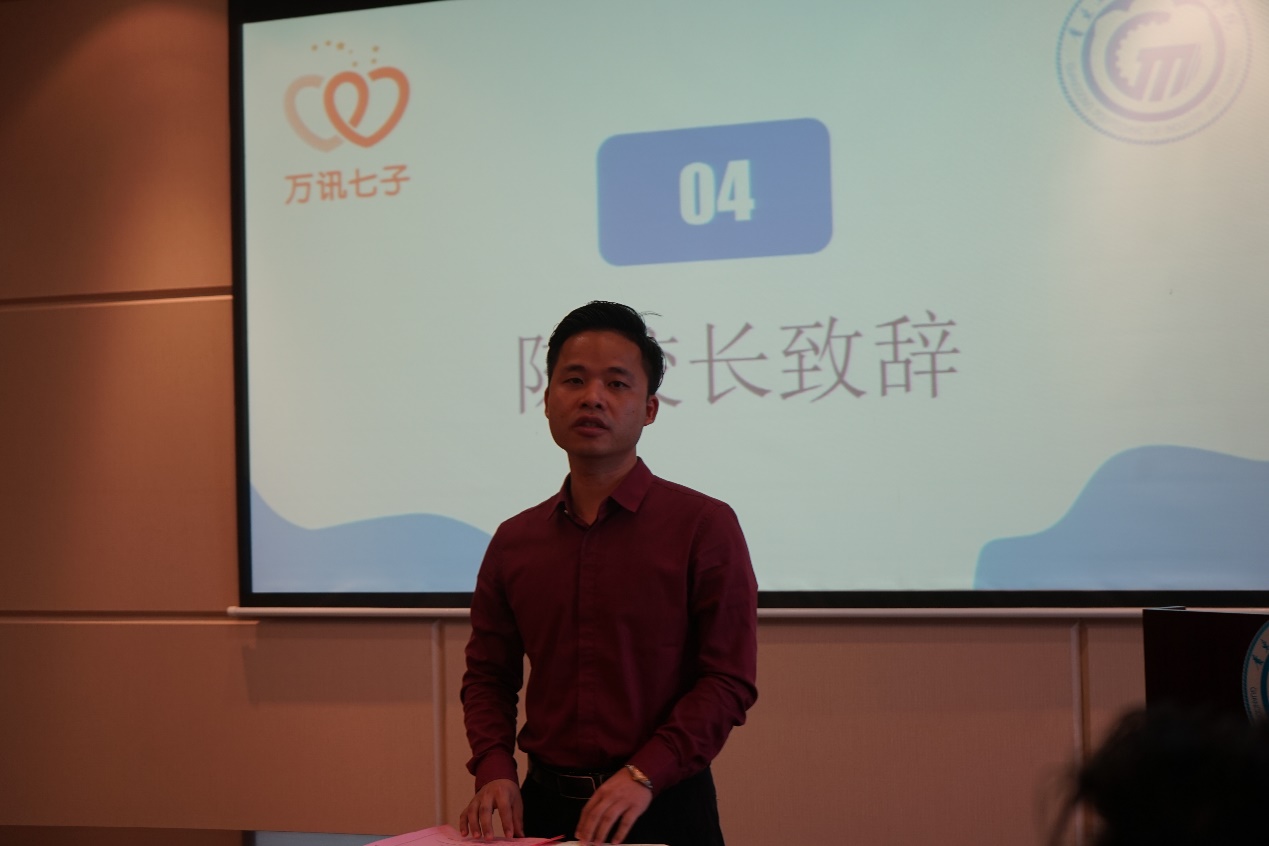 接着,万讯陈创总致辞,表示企业非常需要新的血液,感谢学校和老师为企业倾尽心力培养了未来的优秀员工和创业合伙人。欢迎新晋学徒进入企业培养,企业导师将认真履职,认真带好每一位学徒,精心传授技艺,与学校一起竭尽全力培养出高素质技能型人才。同时,陈总呼吁,同学们要把握好万讯集团创新创业平台的资源和机会,摆平心态,积极有为,发扬艰苦创业精神,遇强越强、敢创敢闯,而企业将要做好创业孵化保驾护航的工作,万讯创业基金和实训中心的配套支持服务随时候命。