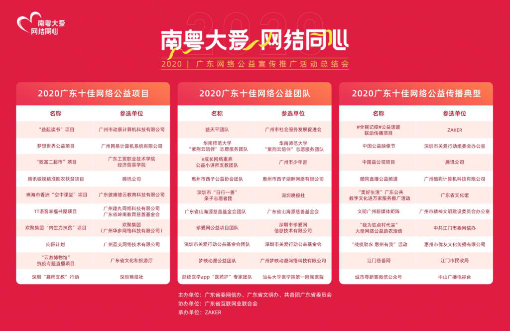 11月24日,由广东省委网信办、广东省文明办、共青团广东省委员会主办,广东省互联网业联合会协办的“南粤大爱 网结同心”——2020广东网络公益宣传推广活动总结会在穗举办。