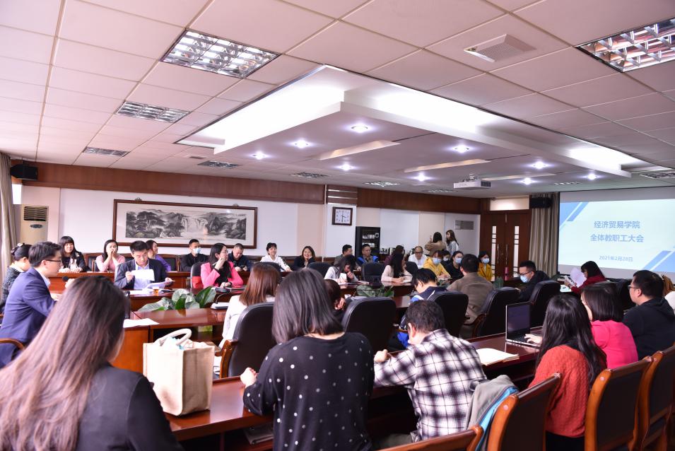 为做好开学初各项工作,2月28日下午,经济贸易学院2020-2021学年第二学期全体教职工大会在天河校区中心会议室召开。学院党总支书记李繁、院长邱秀芳、党总支副书记龚云、副院长蒋晶,两系、两办主任及全体教职工参加会议。会议由李繁同志主持。