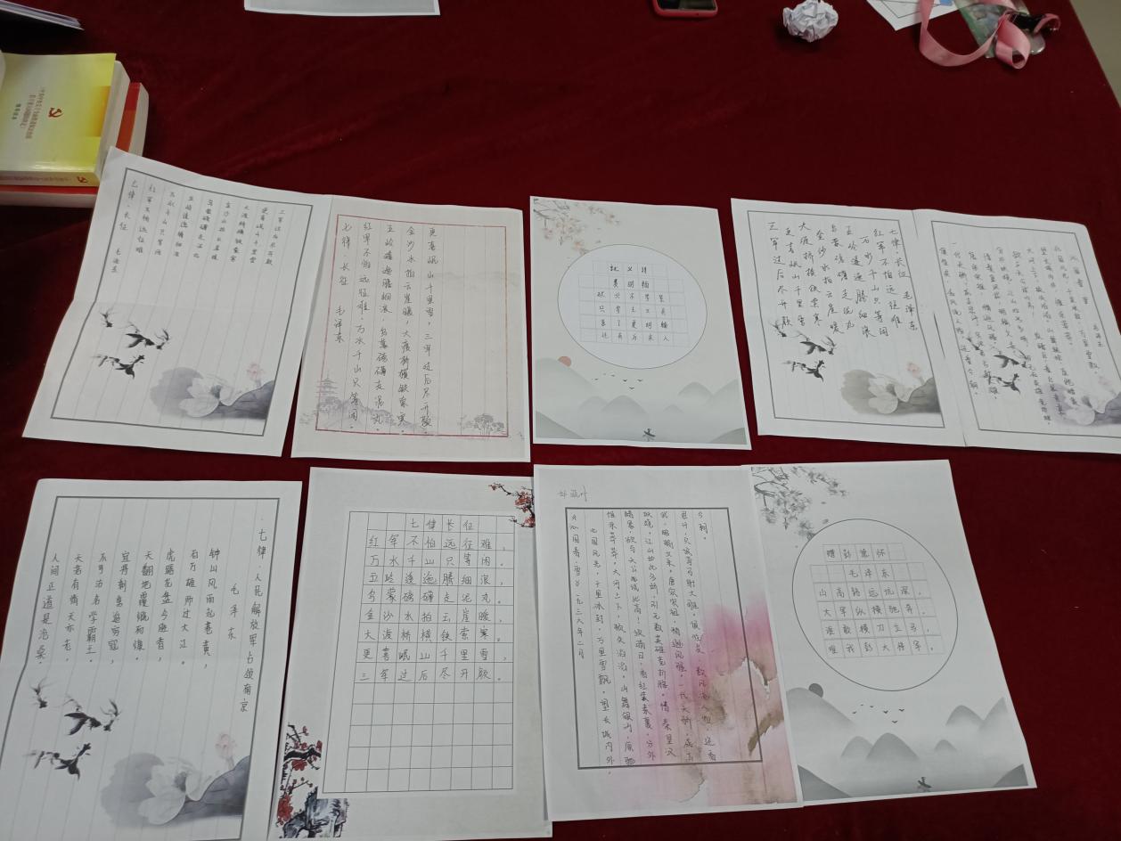 第三支部黄嘉茹书分享《七律·长征》是毛泽东所作的一首七言律诗,写于1935年10月。此诗是毛泽东在红军长征胜利结束时所作。全诗生动地概述了二万五千里长征的艰难历程,赞颂了中国工农红军的革命英雄主义和革命乐观主义精神。