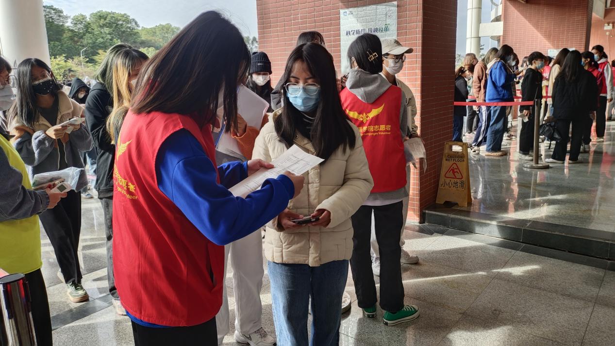服务过程中,志愿者耐心热情地为大家解答疑惑。等待疫苗接种的时间总是漫长的,志愿者提醒同学们带好相关证件,检查同学们的疫苗知情《同意书》,志愿者们严谨认真的表现,成为了疫苗接种一道亮丽的风景。