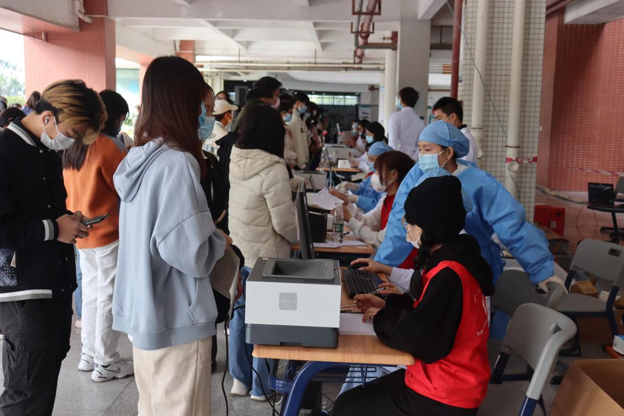 同学们到达测温区测量体温,经过检查的同学们在登记区由医生和志愿者再次检查核对接种疫苗信息无误后,登记个人“第三针”加强相关信息,医生将电子版《预防接种凭证》打印出来,同学们领取个人的凭证,在志愿者的带领下到达接种区。注射疫苗后,志愿者指引同学们到留观区留观30分钟。