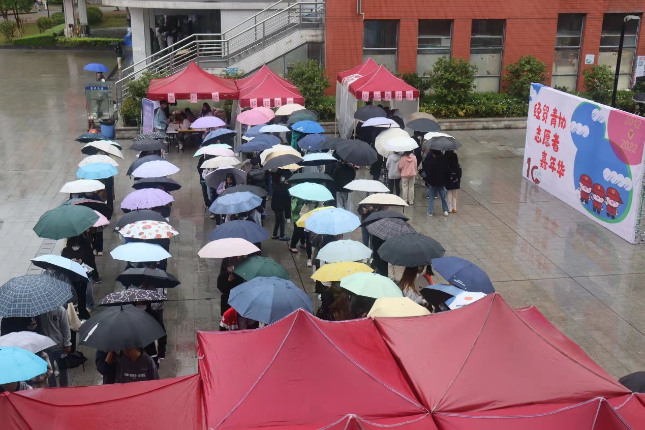 为保证活动顺利开展,工作人员在雨中不敢懈怠地抓紧布场。于14:00,在一切准备就绪后,经贸青协志愿者嘉年华终于正式开幕。