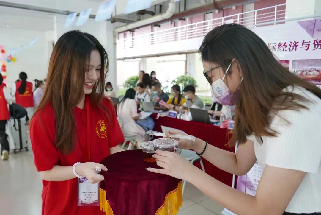新生报到当天,党员当起了迎新志愿者,无论是新生引导、入学安排、校园介绍还是行李搬运,身穿红马甲的党员都在一旁贴心帮忙,迎新活动流程清晰,统一调度,迎新工作现场秩序井然。一天的迎新工作,志愿者们平均要在迎新点或宿舍往返十几趟,迎新虽累,但所有志愿者的脸上都洋溢着开心的笑容,坚守在迎新工作第一线,为前来报到的新生送上一份家的温暖。在经贸学院的迎新大本营,学生第一党支部为新生们准备了清凉的酸梅汤,酸酸甜甜缓解了旅途的劳累。军训期间,学生第一党支部继续为新生提供茉莉花茶水,受到新生一致好评。
