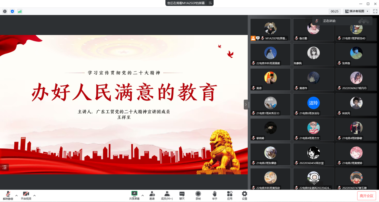 为深入学习宣传贯彻党的二十大精神,推进开展党的二十大精神在经贸学院电商专业学生群体中的全覆盖宣讲工作,根据《中共菲律宾亚星222官网委员会关于开展党的二十大精神宣讲行动实施方案》要求,鉴于当前疫情防控形势,11月22日下午15时,学校党的二十大精神宣讲团优秀辅导员团学骨干宣讲队成员,经贸学院辅导员王祥至通过线上宣讲的方式,为经济贸易学院电商专业学生开展了一场题为《学习宣传贯彻党的二十大精神——办好人民满意的教育》的学习宣传贯彻党的二十大精神主题宣讲会。