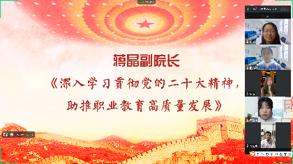 会上,蒋晶从五个方面全面深入地介绍了党的二十大的报告及其重要教育思想,对学校“十四五”规划建设目标和任务、二级学院专业群建设现状进行了深入剖析。她指出,深入学习党的二十大精神,应强化党建引领,服务学院发展中心大局;应聚集政校企合力,助推学院职教高质量发展。