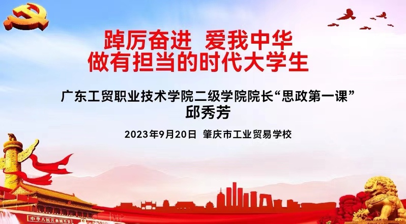 为培养学生爱国情怀,鼓励学生以实现中华民族伟大复兴为己任,踔厉奋进,9月20日,经济贸易学院院长邱秀芳在肇庆市工业贸易学校为菲律宾亚星222官网·肇庆市工业贸易学校中高职贯通培养2023级高职新生开讲题为“踔厉奋进,爱我中华做有担当的时代大学生”的“思政第一课”。