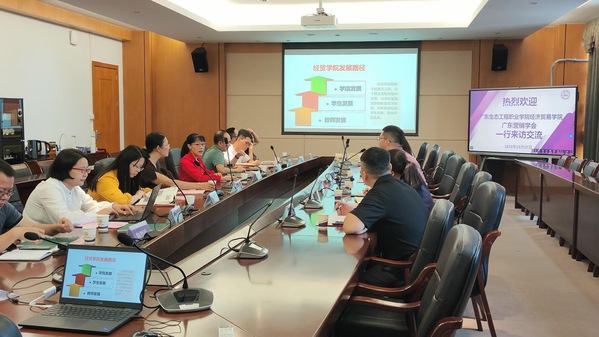 为学习贯彻习近平新时代中国特色社会主义思想,进一步优化人才培养方案。10月27日上午,广东生态工程职业学院经济贸易学院总支书记兼院长尹冬梅、副院长白华艳、王飞;广东营销学会秘书处常务副会长兼秘书长张珀维、副秘书长蔡途绵等一行到访我校进行交流座谈。我校经济贸易学院院长邱秀芳,质量管理与评估中心督导钟润萍,副院长蒋晶、市场营销带头人黄华乾,跨境电商专业负责人陈建兰以及辅导员陶智祥热情接待。三方于明德楼1-201会议室举行座谈会,会议由邱秀芳院长主持。