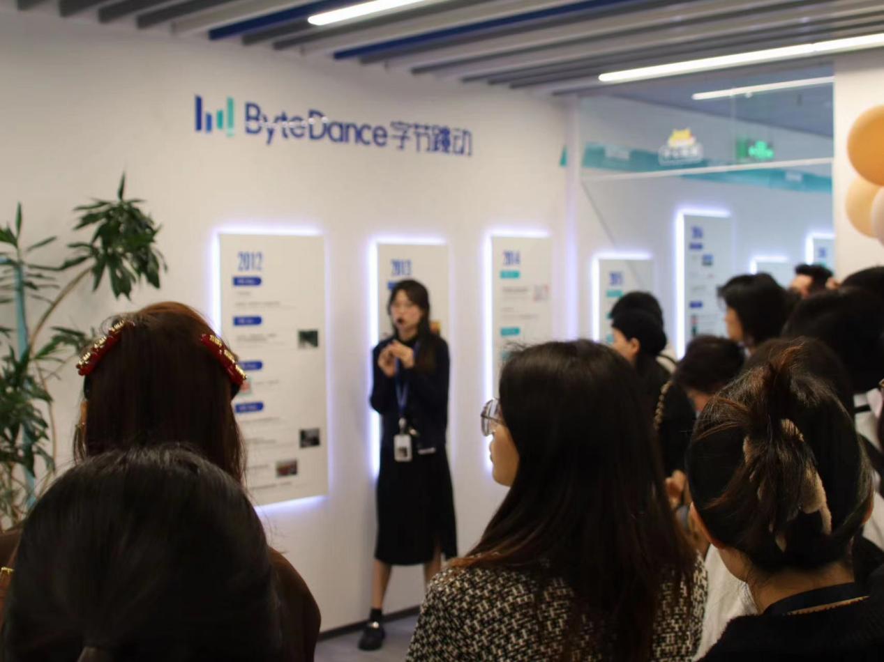 企业员工带领师生们参观了字节跳动赫基工区及企业发展“历史墙”,介绍了企业文化及发展历程。三场精彩的讲座分别由企业专业人士介绍了品牌出新海思路、TikTok海外广投告放的价值与策略及出海电商行业资源分享。