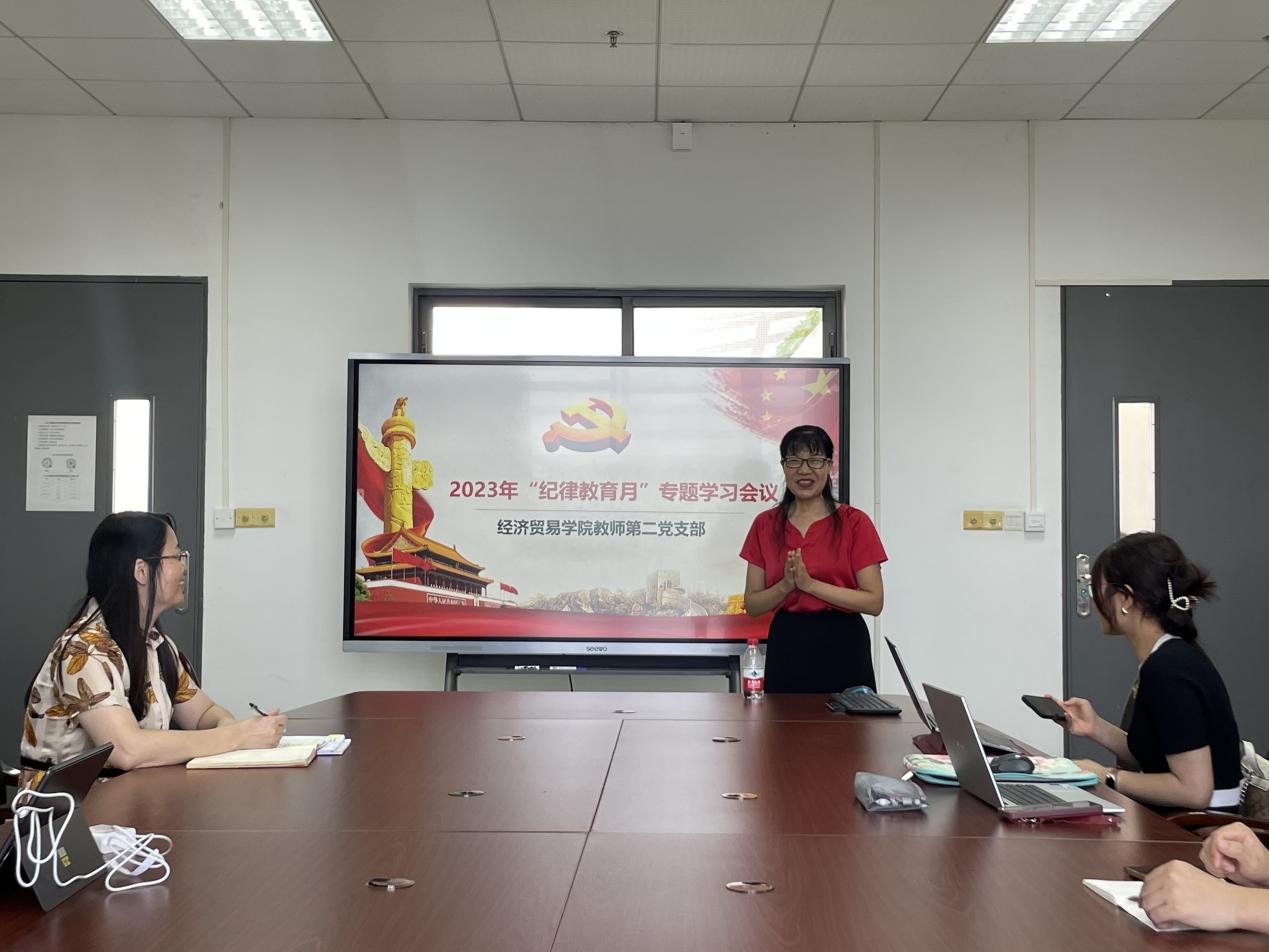 为深入开展学习贯彻习近平新时代中国特色社会主义思想主题教育,全面贯彻落实党中央决策部署,2023年9月4日下午,经贸学院党总支副书记、院长邱秀芳同志在白云校区给经贸学院教师第二党支部上了廉政专题党会,经贸学院党总支副书记、院长邱秀芳同志,教师第二党支部书记、副院长蒋晶同志和教师第二支部党员参加了会议。