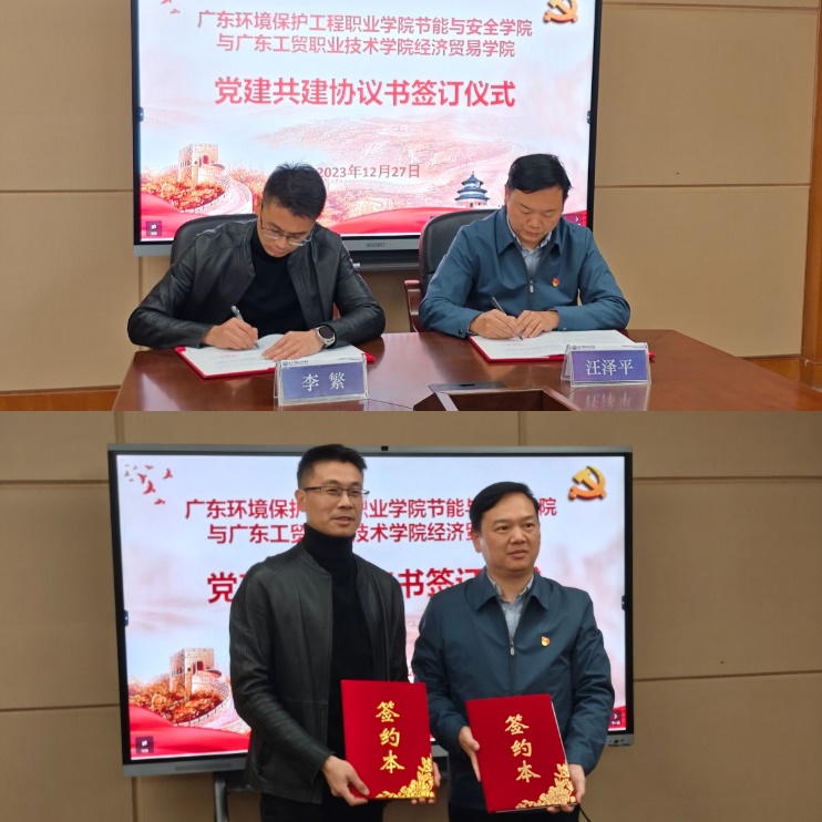 为全面贯彻落实习近平新时代中国特色社会主义思想和党的二十大精神,充分发挥党建引领,以党建促业务,探索兄弟院校二级学院之间的组织共建、工作互助、问题共解的新路径、新方法,以基层党组织共建凝聚双方力量,共同促进高质量发展,12月27日下午,经济贸易学院党总支书记李繁、党总支副书记龚云及部分党务工作教师代表于明德楼1-201会议室,与广东环境保护工程职业学院节能与安全学院党总支书记汪泽平、副书记袁圆、副院长杨帆和党政办公室主任洪佳勤一行热情深入交流并签订党建共建协议书。