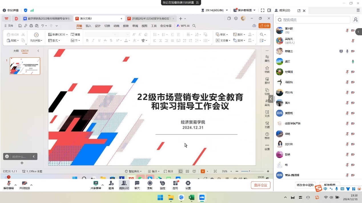 临近寒假,为做好22营销安全教育和实习指导工作,12月31日,经贸学院成功召开了22营销安全教育和实习指导工作会议。出席会议的人员包括经贸学院党总支副书记龚云、跨境数字营销系主任陈建兰、辅导员吴海英、22营销全体班主任及实习指导老师。
