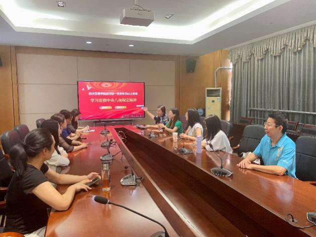 5月13日,经济贸易学院教师第一党支部在明德楼1-201会议室召开“深入贯彻中央八项规定精神学习教育”专题党课学习会,党支部书记廖晓虹主讲,全体党员参会。