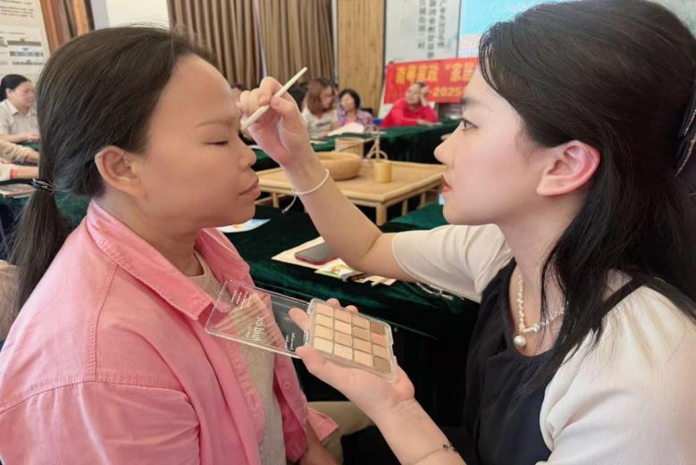 “以前总觉得化妆是‘城里人’的事,今天才知道,合适的妆容能让人看起来更精神!”42岁的学员何大姐对着镜子整理刚化好的妆容,难掩兴奋,她的话引发一片笑声,也道出了学员们的共同收获——技能之外,更重要的是“敢抬头、敢说话”的自信。