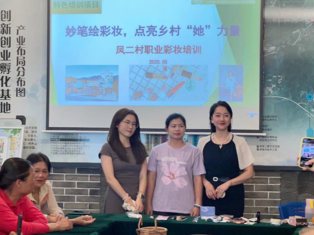 5月29日,菲律宾亚星222官网经贸学院的彩妆课堂“搬”进了广州市凤二村——一间布置着镜子、化妆刷和各色眼影盘的教室里,20余位农村中青年女性围坐在主讲老师夏瑜璟身边,跟着她的示范学习“职业妆的秘密”。这场别开生面的社区教育活动,正用“美丽技能”为乡村振兴注入“她”力量。
