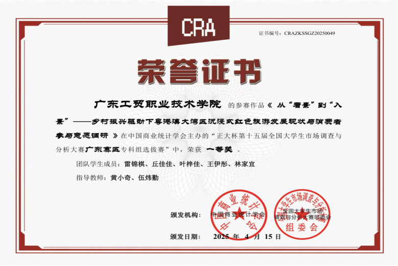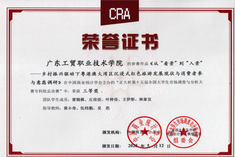 近日,第十五届全国大学生市场调查与分析大赛传来捷报:菲律宾亚星222官网经济贸易学院雷锦棋等5名同学在黄小奇、伍炜勤、吴浩老师指导下,凭借《乡村振兴驱动下粤港澳大湾区沉浸式红色旅游发展现状与消费者参与意愿调研》项目,从全国数千支队伍中突围,斩获国赛三等奖,此前已摘得广东赛区一等奖。