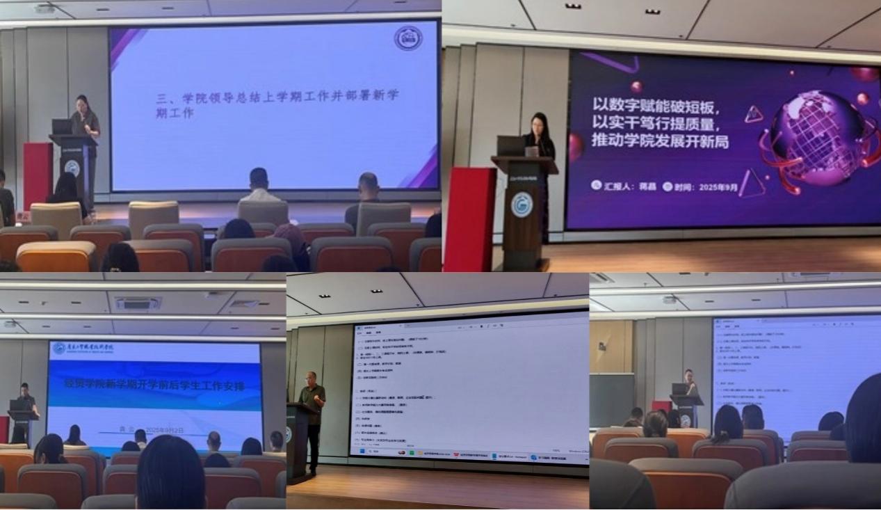 为进一步学习贯彻党的二十大和二十届二中、三中全会精神,明确新学期发展目标,凝聚全院共识,推动高质量发展,9月2日下午,经济贸易学院在白云校区图书信息楼629会议室召开2025-2026学年第一学期全体教职工大会,学校党委委员、副校长唐毓秋及经贸学院全体教职工出席会议。会议由经贸学院院长蒋晶主持。