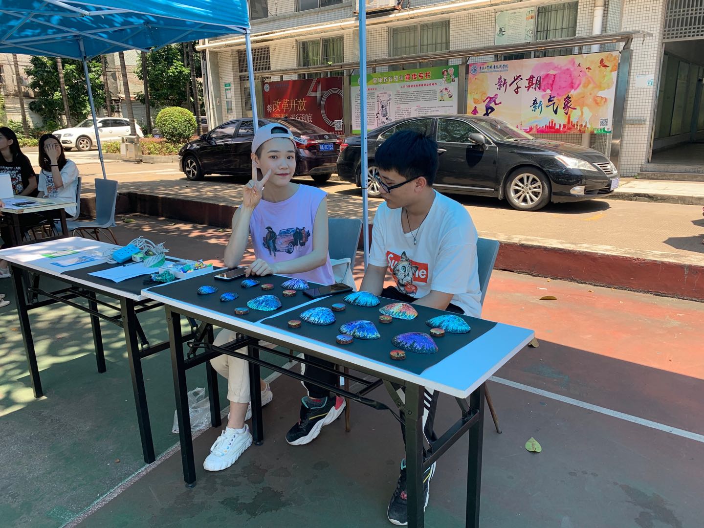 参与此次实践活动的商品可谓是琳琅满目,除了有各种各样的常见物品--水果冰、水果凉粉、携带式小风扇等,还有一些是与学生专业相关的物品,比如说来自18数艺1班的团支书林芝青带来了自己的亲笔力作--水彩贝壳画、水彩石头画和水彩木头画,这些极具有美感的作品立即吸引了无数的眼球,购买者称赞不绝。