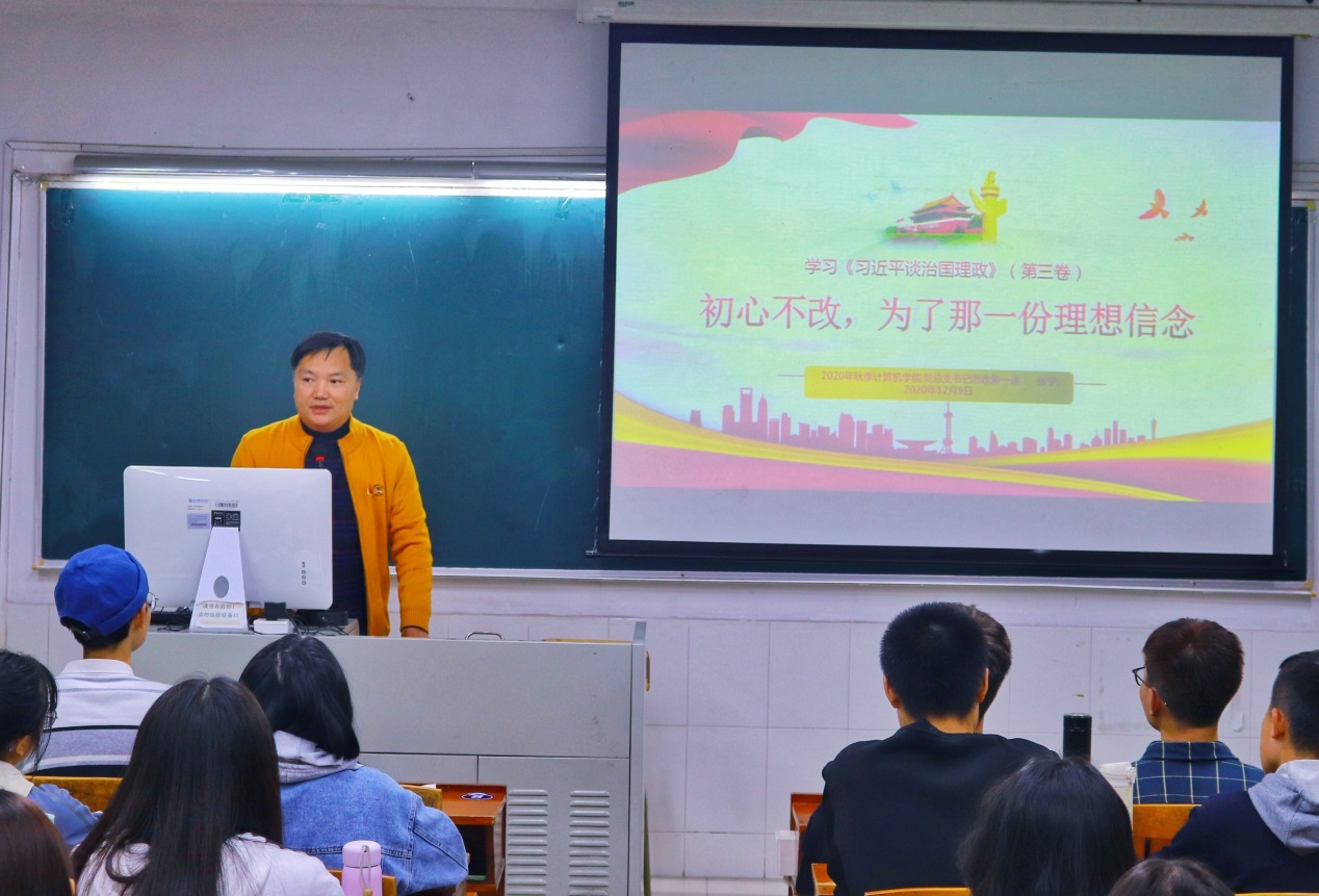根据学校党委安排,12月9日晚,计算机学院党总支书记上第一堂思政课活动在天河校区教学楼203举行。党总支书记张宁围绕学习《习近平谈治国理政》第三卷的内容,以《初心不改,为了那一份理想信念》为题,为20级新生代表上了一堂生动的思政课。