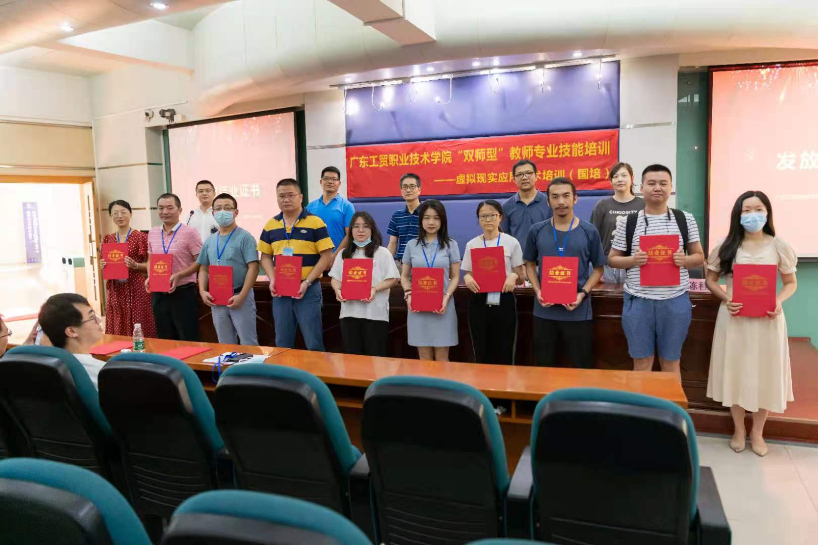 最后,进行了结业证书颁发仪式。本次国培项目为提高教师在虚拟现实应用技术的教学能力和教学技术水平,同时也为虚拟现实应用技术专业的发展搭建了合作与交流的平台,来自不同高职院校的学员在这里互相学习、互相讨论,打造了浓厚的虚拟现实技术研究氛围,这也是一次我校践行党史学习教育“我为群众办实事”的重要举措。