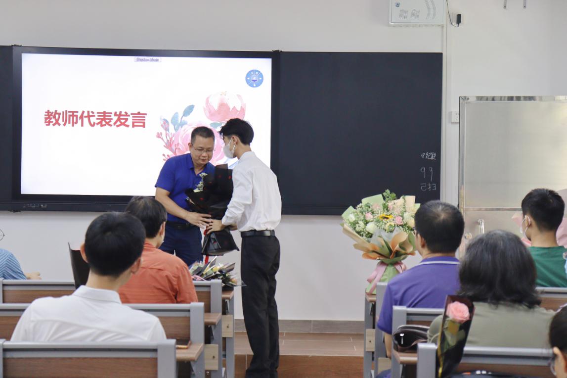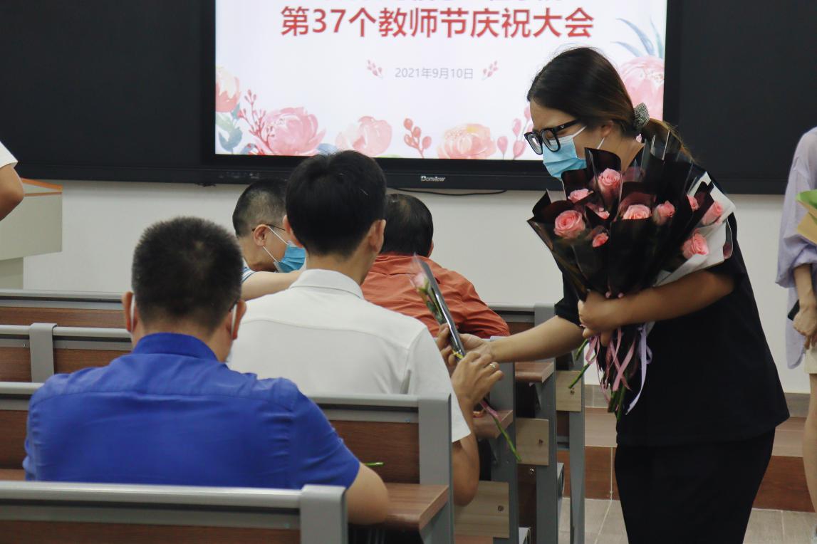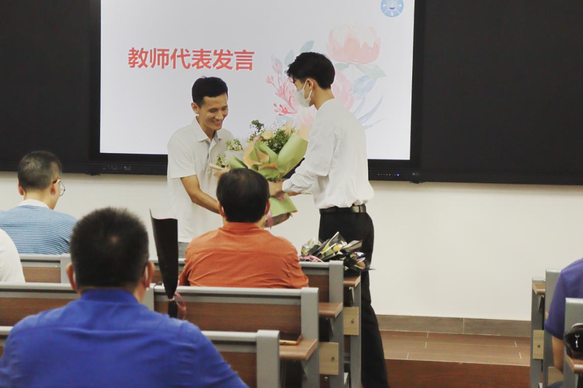 庆祝大会特别邀请了两位教师代表发言,分别是优秀辅导员苏建荣、优秀教师代表黄培泉。苏建荣老师结合自身的从教经历,分享了自己对坚守岗位,做好本职工作的心得体会。黄培泉老师从专任教师的角度,谦逊的表达了对三尺讲台的敬畏。黄老师认为踏踏实实上好每堂课,就是好老师。大会还分别向获得优秀班主任、优秀教育工作者、优秀教师等荣誉称号的教师举行了颁奖仪式,学院领导分别为他们颁发了荣誉证书。与会的学生代表特别用心的准备了花束与手捧花,送给现场的每位老师。